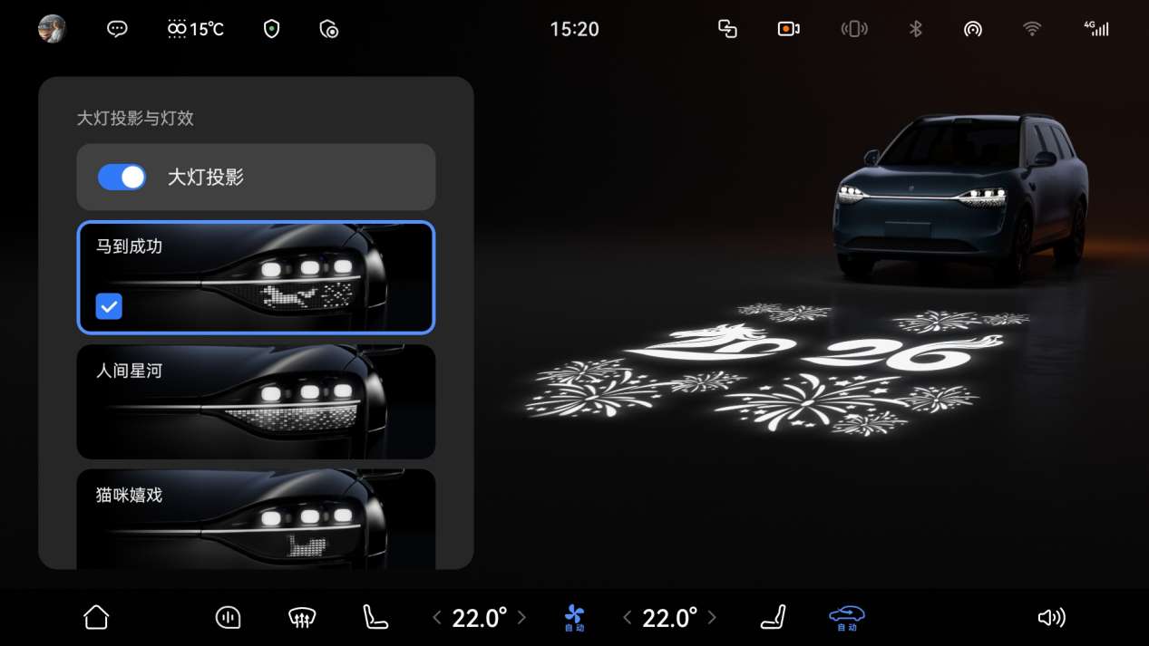 12、新增“马到成功”迎宾灯效,在解锁或锁车时向地面投射烟花动画、骏马图案及“2026”字样;情景灯语新增“一路生花”小红花样式及更多城市橱窗图案。
