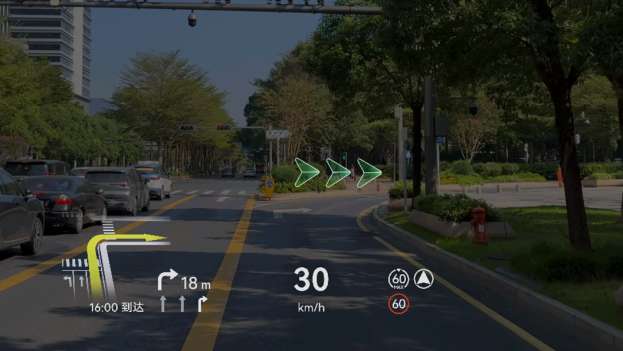 7、新增抬头显示车道指引功能,开启车道指引后,人驾状态下导航开启时,道路中显示引导光毯,路口时显示箭头指引。