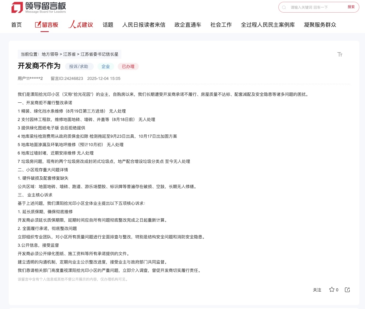 2025年12月4日,有自称是溧阳拾光印小区(又名“拾光花园”)业主的网友通过人民网领导留言板投诉,称自成功购房并办理入住手续以来,长期被开发商此前承诺的多项整改事项未兑现、房屋本体及小区公共区域质量不达标等一系列问题持续困扰,这些问题不仅影响居住的舒适度,更对业主的正常生活秩序造成干扰,严重降低了整体居住体验。