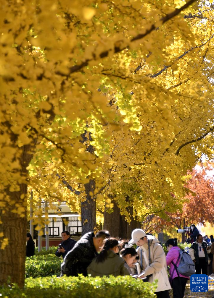 深秋时节,北京市街头和公园内的银杏等树木挂满黄叶,浓浓的秋色吸引大批市民踏秋赏景。