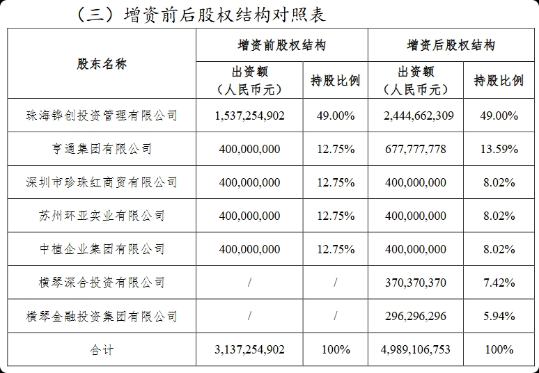 据悉,横琴深合由横琴粤澳深度合作区财政局全资持股,横琴金投则由珠海国资委旗下的格力集团持股90%、广东省财政厅持股10%。本次增资完成后,横琴人寿的注册资本将由约31.37亿元增加至49.89亿元,上述四位股东持股比例分别为49%、13.59%、7.42%、5.94%。