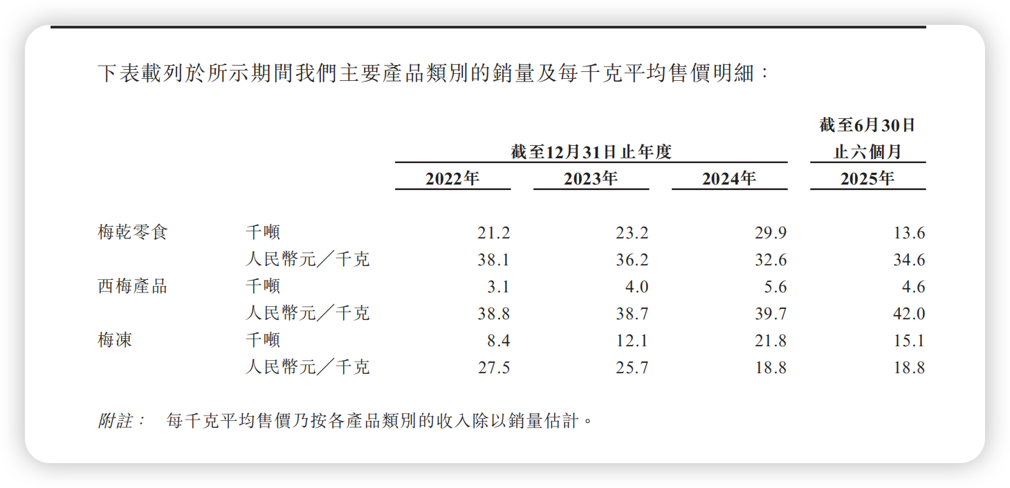 降价有效地刺激了销量。梅干零食销量从2.12万吨增至2.99万吨,收入随之提升至9.74亿元;而梅冻产品的市场表现尤为亮眼,销量激增160%至2.18万吨,推动收入大幅增长至4.10亿元。