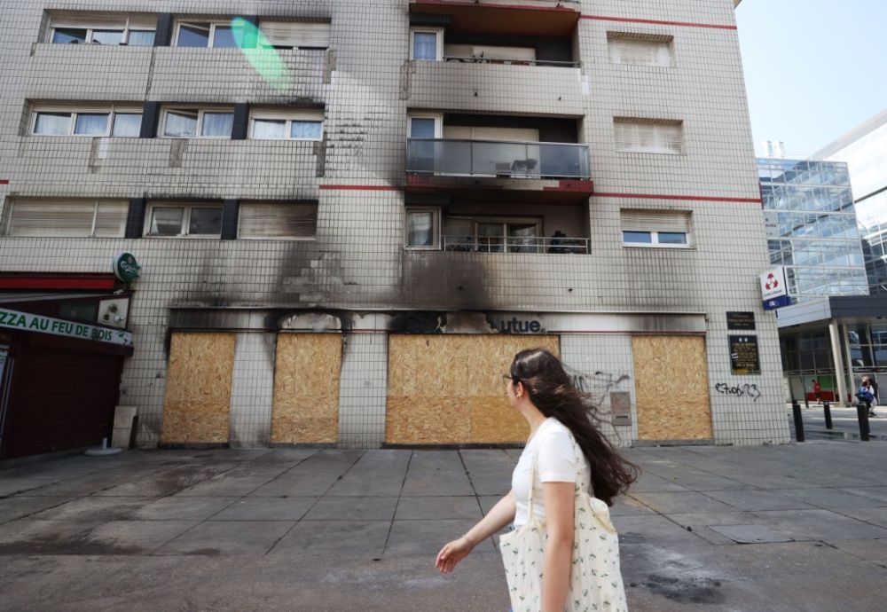 6月30日,在法国上塞纳省楠泰尔市,一家银行所在的建筑被纵火破坏。新华社记者高静摄