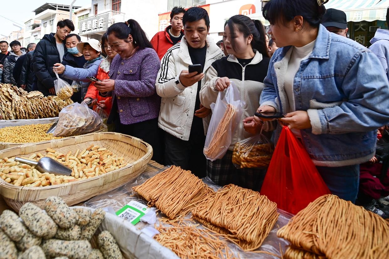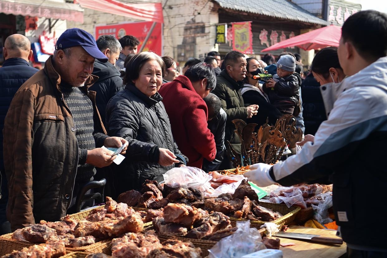2月13日,游客在焦岱大集上选购特色食品。新华社记者 邹竞一 摄