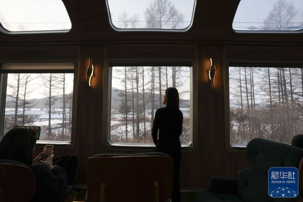 ↑12月6日,游客在“伊春号”旅游专列车厢中观赏铁路沿线风景。