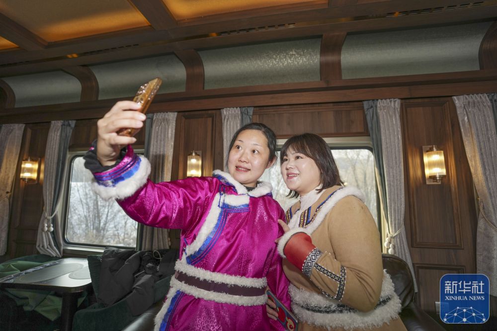 ↑12月6日,身穿民族服饰的游客在“伊春号”旅游专列车厢中拍照留念。