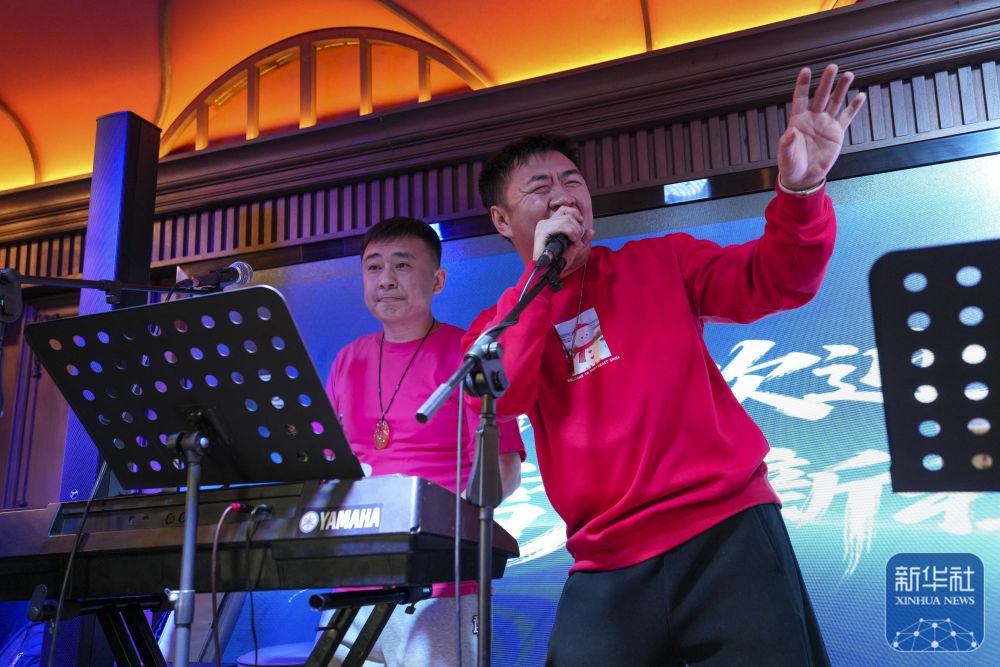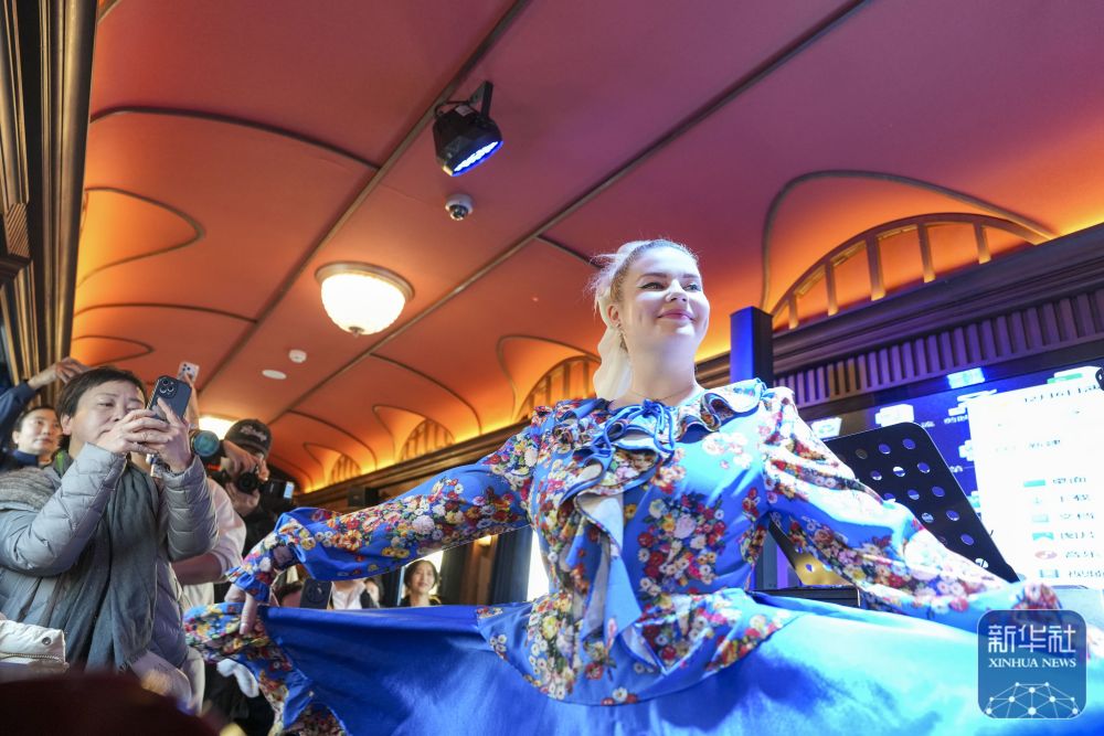 ↑12月6日,哈尔滨冰雪大世界梦想大舞台主持人姜可东(右)在“伊春号”旅游专列车厢中表演。