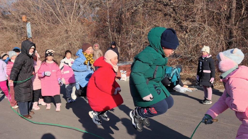 12月3日,吉林省第二实验学校的学生在南湖公园开展“亲近自然银冬初体验”主题活动,图为学生们在跳大绳。新华社记者李典摄