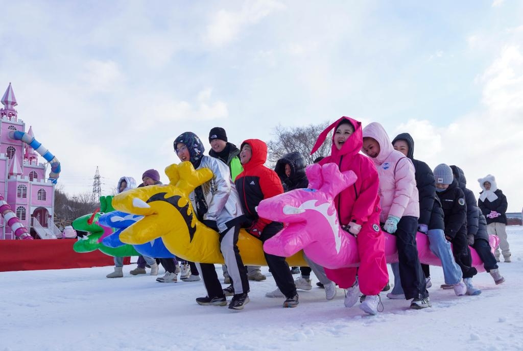 12月3日,吉林市中小学生在吉林市纳美山谷度假区参加“雪地龙舟”趣味活动。新华社记者颜麟蕴摄