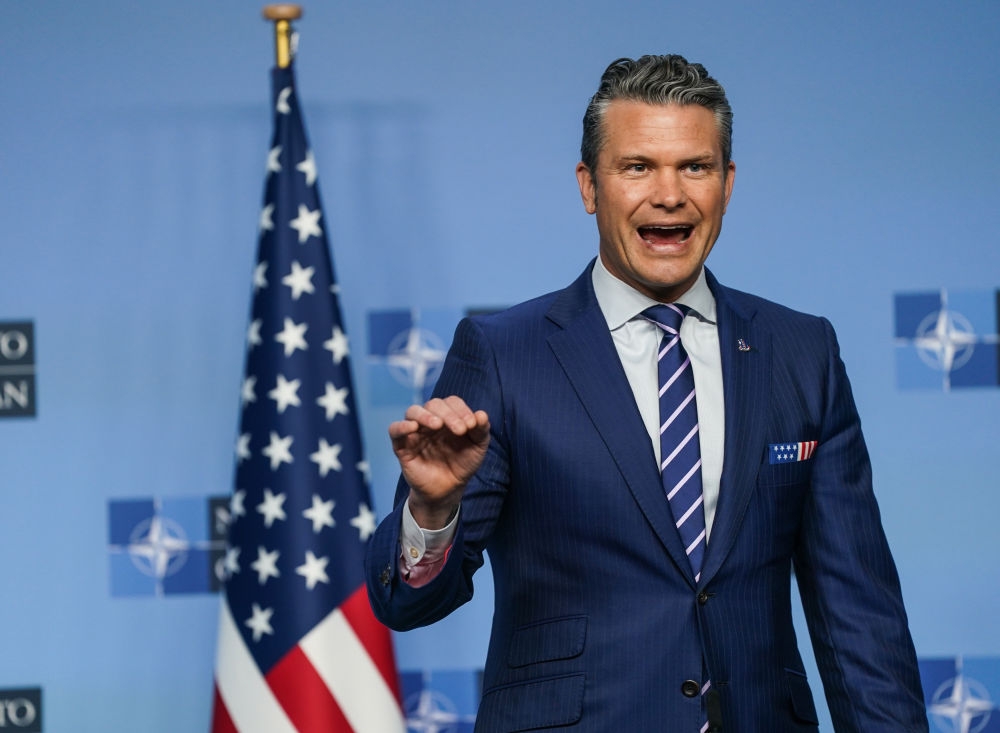 10月15日,在比利时布鲁塞尔,美国国防部长赫格塞思在记者会上发言。新华社记者彭子洋摄