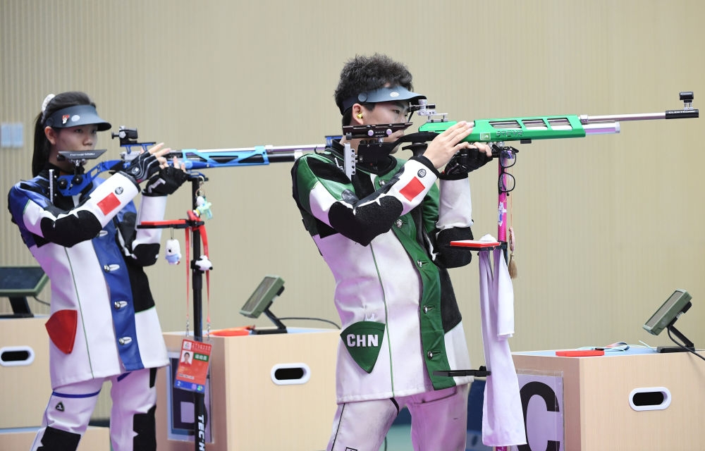 10月12日,辽宁队选手杜雨宸(左)、刘柏辰在10米气步枪混合团体决赛中。新华社记者邓华摄