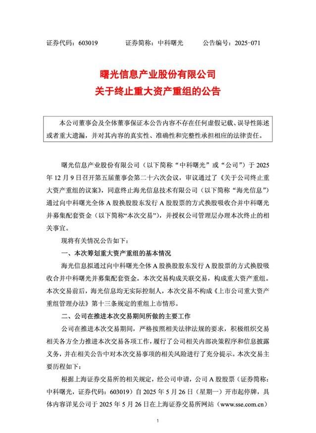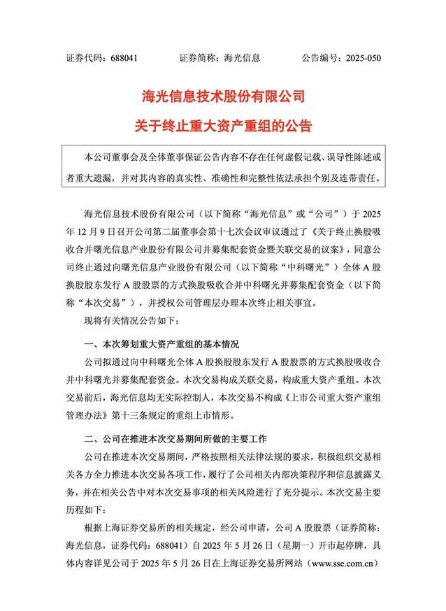 2025年12月9日,一个普通的周二下午,海光信息技术股份有限公司突然抛出一份公告,标题很简单,只有十几个字,终止重大资产重组的公告。可就是这份公告,像一盆凉水浇在了无数盯着这件事大半年投资者的头上。原本被市场寄予厚望的海光信息换股吸收合并中科曙光这条超级大鱼,就这么悄无声息地放生了。