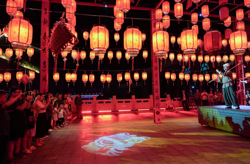 2024年5月12日,游客在西安长安十二时辰主题街区内观看演出。街区通过汉服旅拍、演艺互动、非遗体验等项目,让游客“穿越”回盛唐长安,为游客打造科技感、文化味十足的游历体验。
