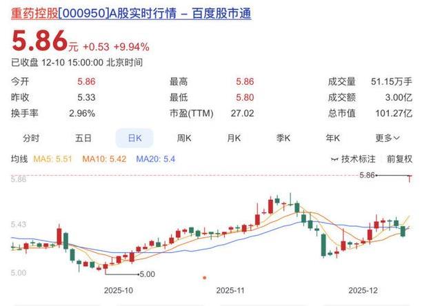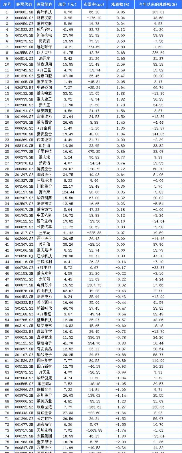 十二月十号这天,重庆的股市突然像过年一样热闹,七八家本地A股上市公司里,竟然有三十九家收了红盘,半壁江山都绿油油变红彤彤,这在今年可不多见。尤其是前三名,直接把涨停板按在地上摩擦,再升科技一个涨停收在六块九毛六,财信发展和重药控股双双九点九四个点涨停,并列第二,把后面那一大群追着跑的股票甩得老远。很多人一看手机就乐了,心想这重庆板块终于扬眉吐气一回,可转头再细看财报和消息面,又忍不住挠头,这涨得有几分是真金白银,几分是空气突然热了?