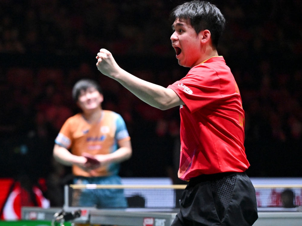 12月7日,林诗栋在男单比赛中庆祝。新华社记者胥冰洁摄