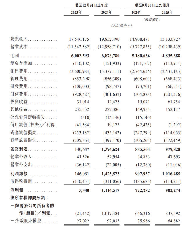 招股书显示,2023年、2024年和2025年前九个月,君乐宝公司的营收分别是175.46亿元、198.32亿元和151.34亿元,分别同比增长13.0%、1.52%。经调整净利润分别为6.03亿元、11.61亿元和9.45亿元,分别同比增长92.54%、25.00%;经调整净利润率分别是3.4%、5.9%、6.2%。