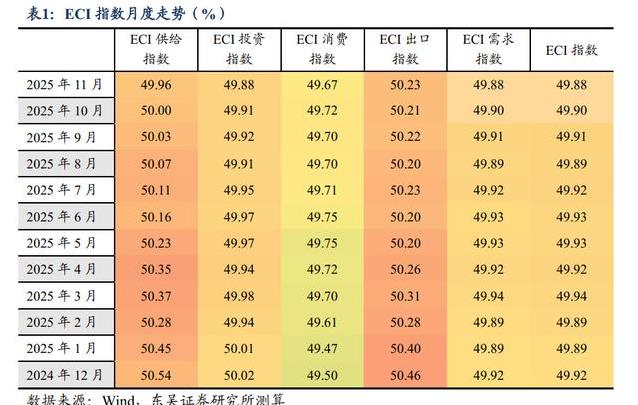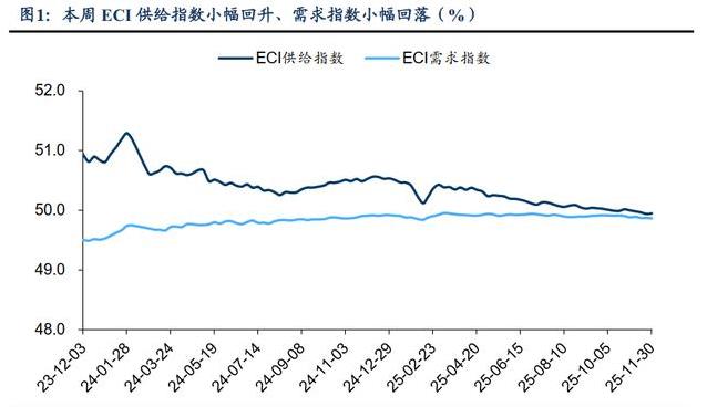 截至2025年11月30日,本周ECI供给指数为49.95%,比上周上升了0.01个百分点。需求指数为49.86%,比上周下降了0.01个百分点。这些数据反映出经济运行中供需两端的具体变化。供给指数接近50%,表明供给端的活动保持相对稳定。需求端的指数小幅回落,显示需求力度出现轻微减弱。