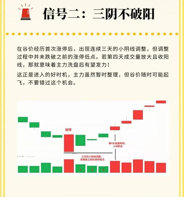 抓这几种信号,最怕急。很多人看到缩量阴线就慌,割肉跑了,结果第二天直接涨停。也有的人看到三根阴线就冲进去,结果第四天继续跌。最好等到确认信号出来。比方说三阴不破阳,等第四天放量收阳,收盘站稳前高再买。揉搓线等第二天长下影收盘确定再进。缩量十字星等下一根阳线放量再动手。