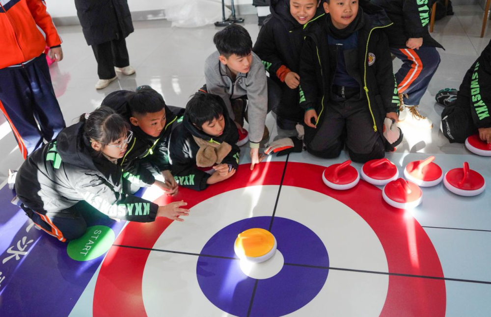 12月3日,吉林市松江东路小学校学生在吉林市纳美山谷度假区体验旱地冰壶。新华社记者颜麟蕴摄