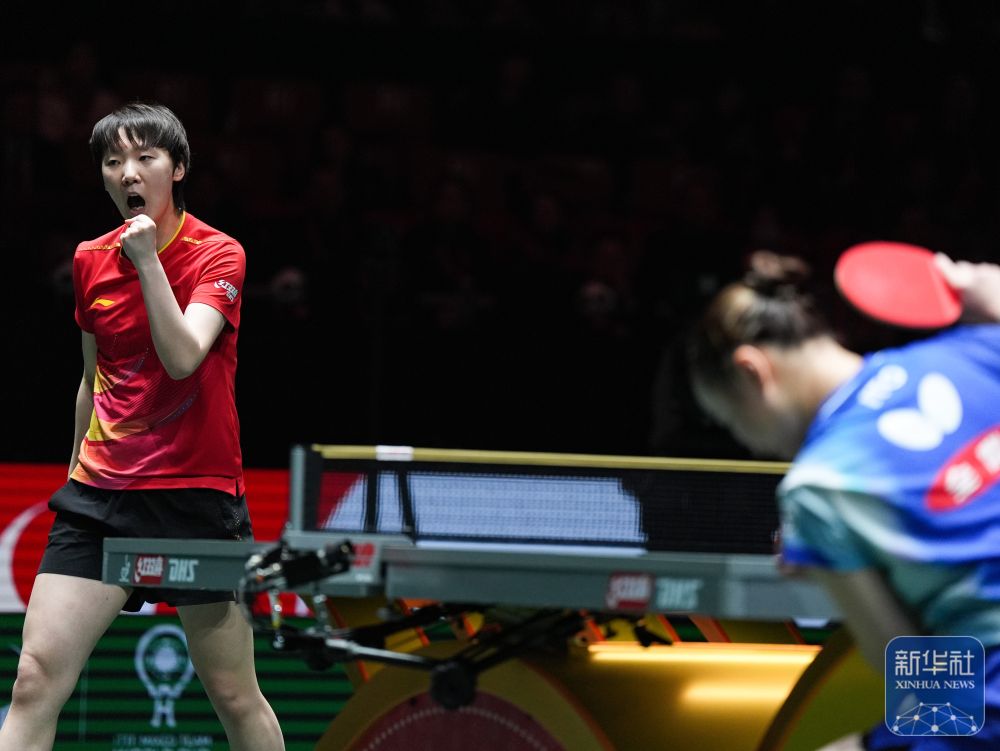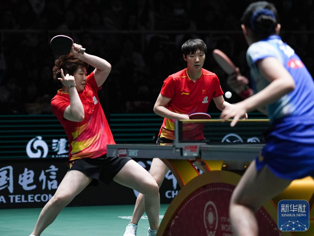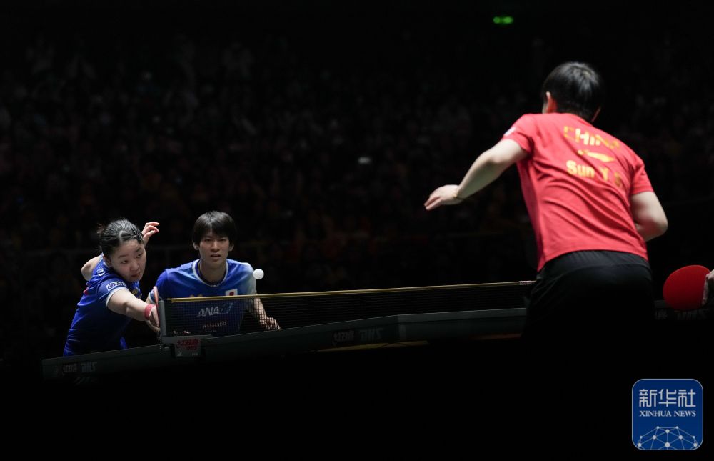↑中国队组合王曼昱/蒯曼(左)在比赛中。最终,她们在女双比赛中1比0战胜日本队组合张本美和/大藤沙月。新华社记者王曦摄