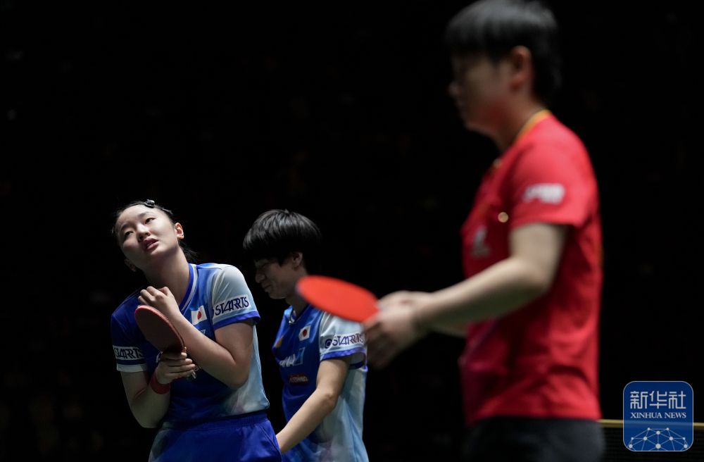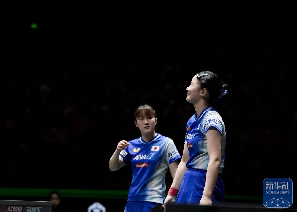 ↑日本队组合张本美和(右)/大藤沙月在比赛中。最终,她们在女双比赛中0比1不敌中国队组合王曼昱/蒯曼。新华社记者王迎摄