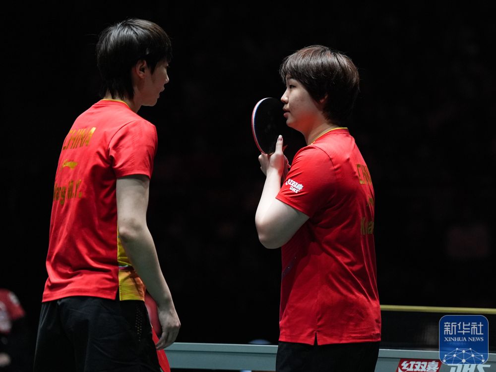 ↑中国队组合王曼昱(左)/蒯曼在比赛中商量战术。最终,她们在女双比赛中1比0战胜日本队组合张本美和/大藤沙月。新华社记者王曦摄