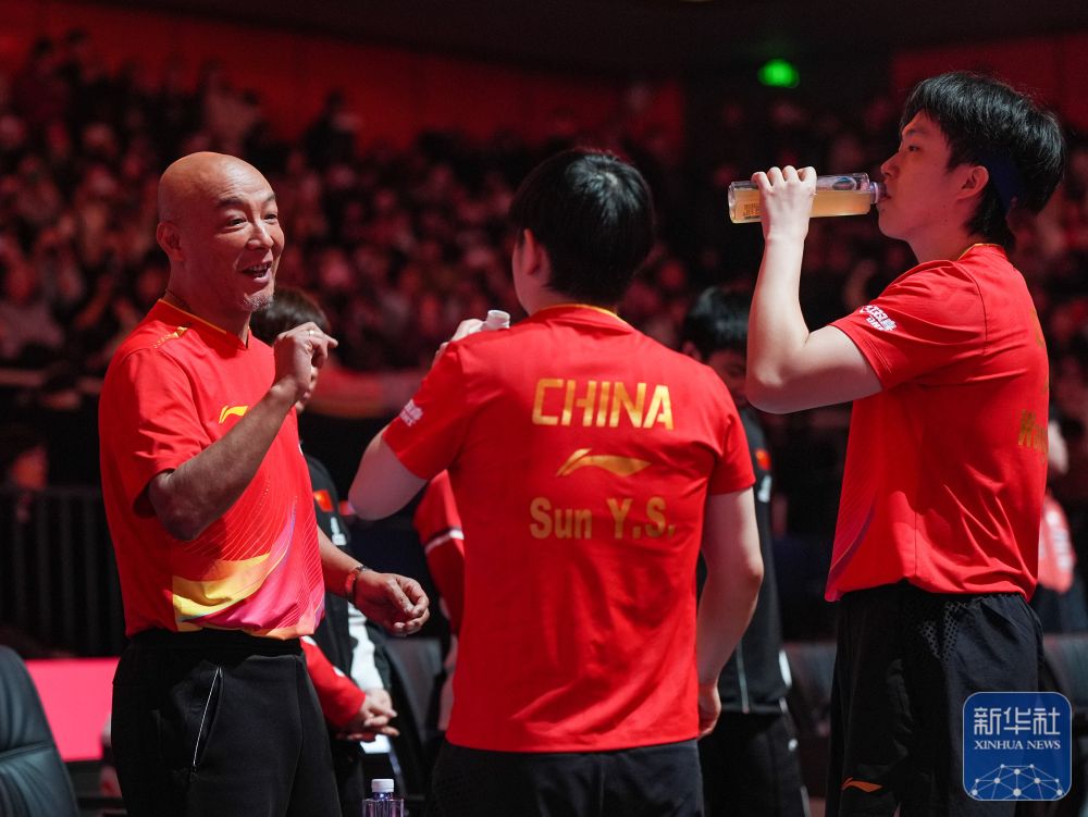 ↑中国队组合孙颖莎(中)/王楚钦(右)在比赛间隙接受教练肖战指导。最终,他们在混双比赛中3比0战胜日本队组合户上隼辅/张本美和。新华社记者王曦摄