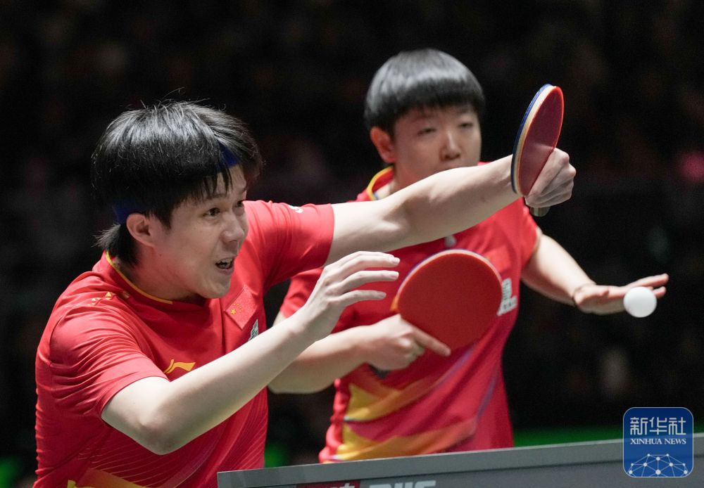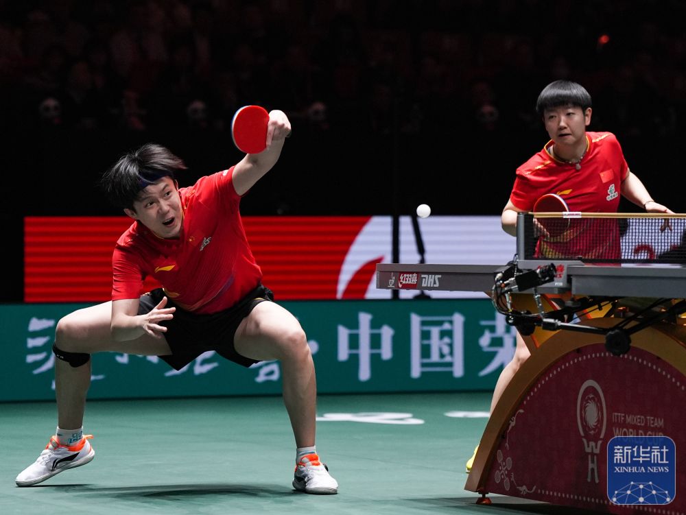 ↑中国队组合孙颖莎(右)/王楚钦在比赛中。最终,他们在混双比赛中3比0战胜日本队组合户上隼辅/张本美和。新华社记者王曦摄