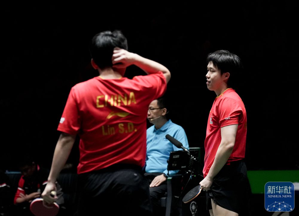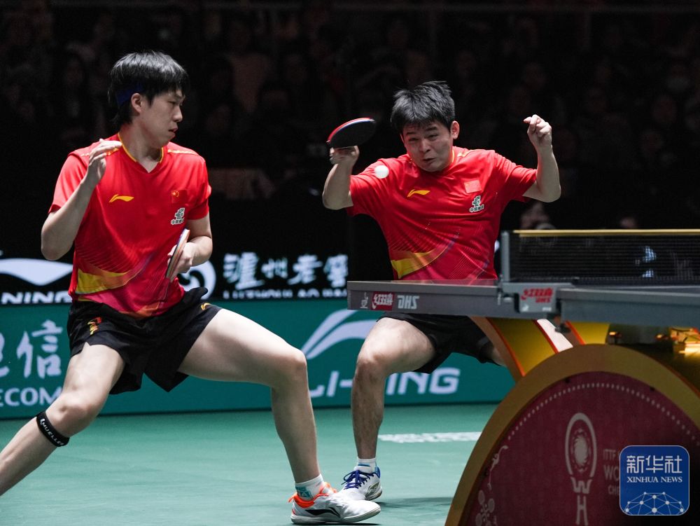 ↑中国队组合林诗栋/王楚钦(左)在比赛中。最终,他们在男双比赛中1比2不敌日本队组合篠塚大登/户上隼辅。新华社记者王曦摄