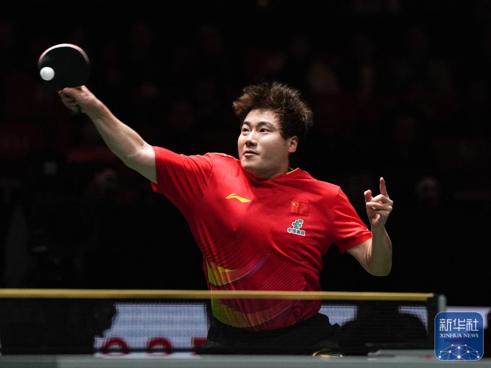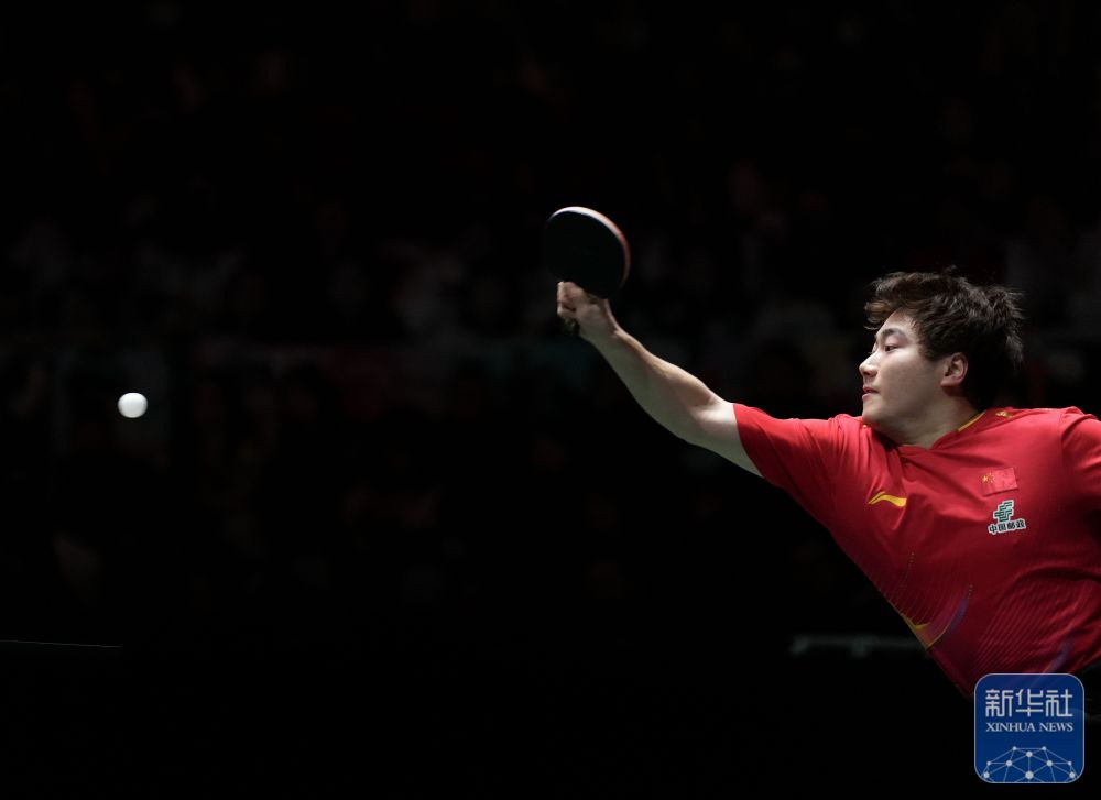 ↑中国队选手梁靖崑在比赛中回球。最终,他在男单比赛中1比2不敌日本队选手松岛辉空。新华社记者王迎摄