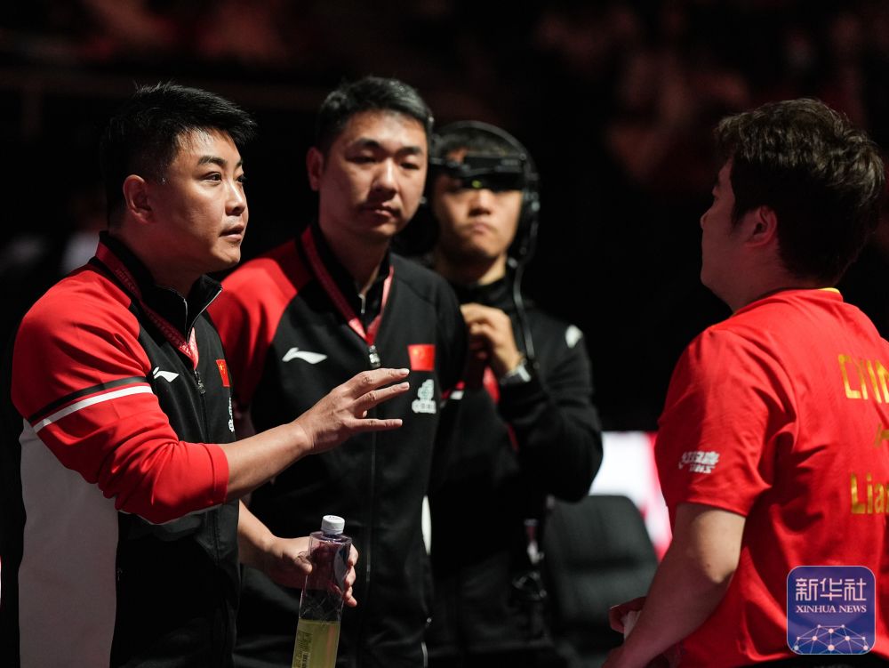 ↑中国队选手梁靖崑(右)在比赛间隙接受教练王皓的指导。最终,他在男单比赛中1比2不敌日本队选手松岛辉空。新华社记者王曦摄