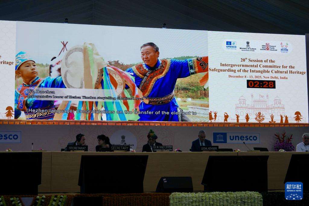 12月11日,在印度新德里举行的联合国教科文组织保护非物质文化遗产政府间委员会第20届常会上,大屏幕上播放中国“赫哲族伊玛堪”保护成果。新华社记者伍岳摄