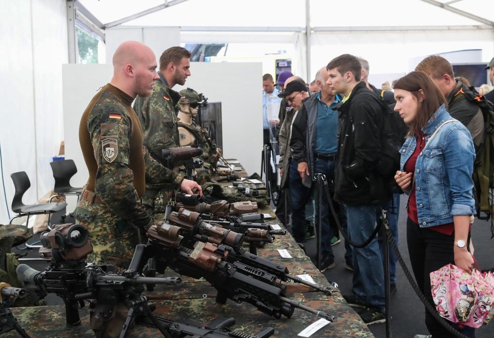 2019年8月18日,在德国首都柏林,两名德国联邦国防军成员向参观者介绍武器装备。新华社记者单宇琦摄