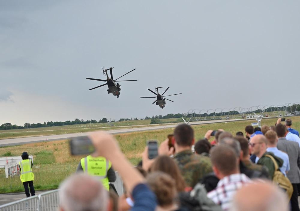 2024年6月5日,在德国舍内费尔德,人们在2024柏林国际航空展上观看直升机表演。新华社记者任鹏飞摄